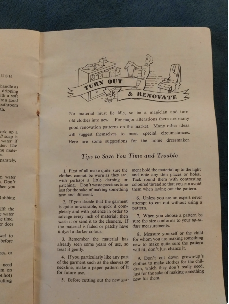 La campagne “Make Do and Mend” en Angleterre encourageaient les citoyens à raccommoder, réutiliser et transformer leurs vêtements pour économiser les ressources. Les couturières développaient des astuces pour réparer et embellir des tenues anciennes. Aux États-Unis, les femmes étaient incitées à recycler leurs vêtements, même leurs robes de soirée, en les simplifiant pour être plus pratiques.